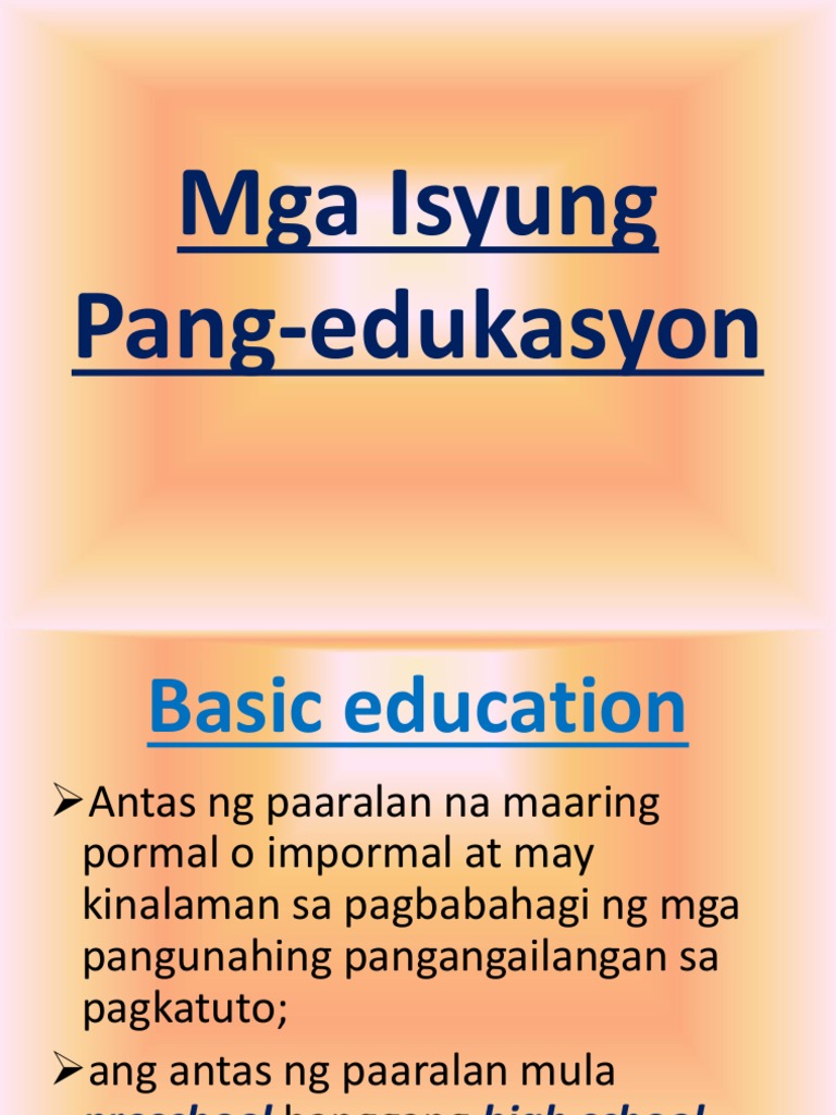 Mura at Dekalidad na Edukasyon Bagaman mayroong programa ang pamahalaan para sa murang edukasyon sa pamamagitan ng mga pampublikong paaralan at unibersidad hindi pa rin maitatanggi na maraming kakulangan ang hinaharap ng mga mag-aaral at mga guro sa. KALAGAYAN NG KABATAAN SA KASALUKUYANG LIPUNAN ISYU NG KABATAAN SA EDUKASYON Kalakhan ng mga kabataaan ang hindi nakapag-aral nakagapos sa kamangmangan at kakarampot ang pinag-aralan Dahil sa kahirapan hindi na kayang bayaran ang patuloy na tumataas na halaga ng matrikula 2012 -. Tinukoy ng Propesor na si.